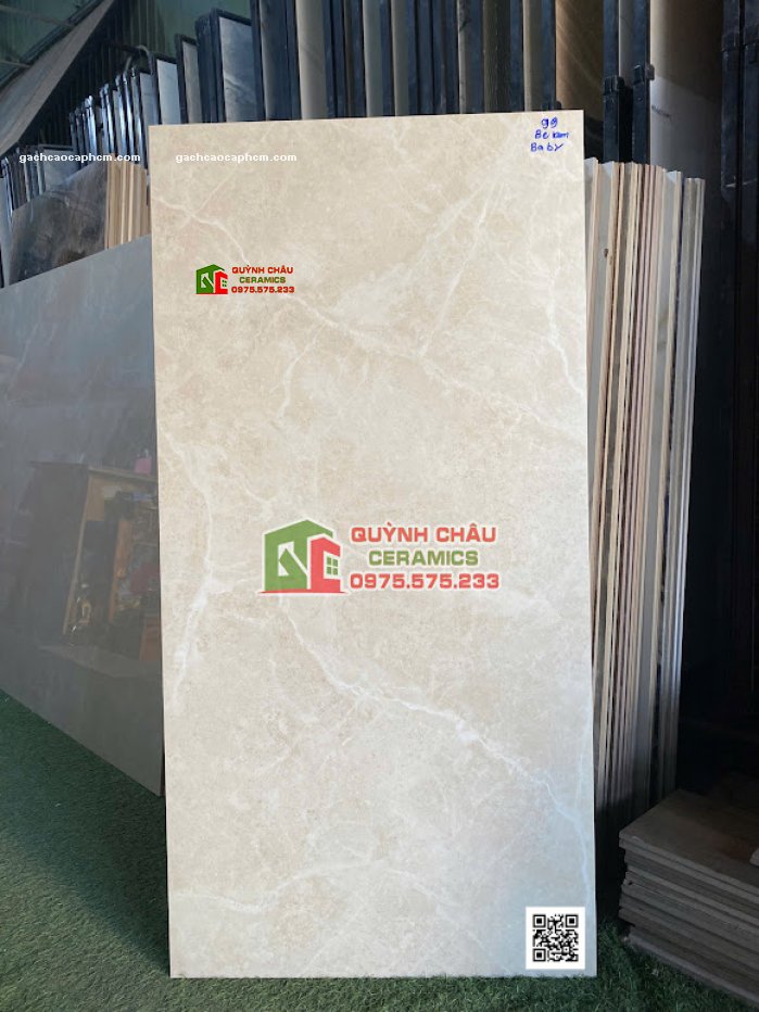 Kích thước khổ lớn 60x120 đang là xu hướng giúp mở rộng thị giác không gian. Màu kem vân đá nhẹ nhàng cực kỳ phù hợp với phong cách tối giản (Minimalism) và hiện đại.
